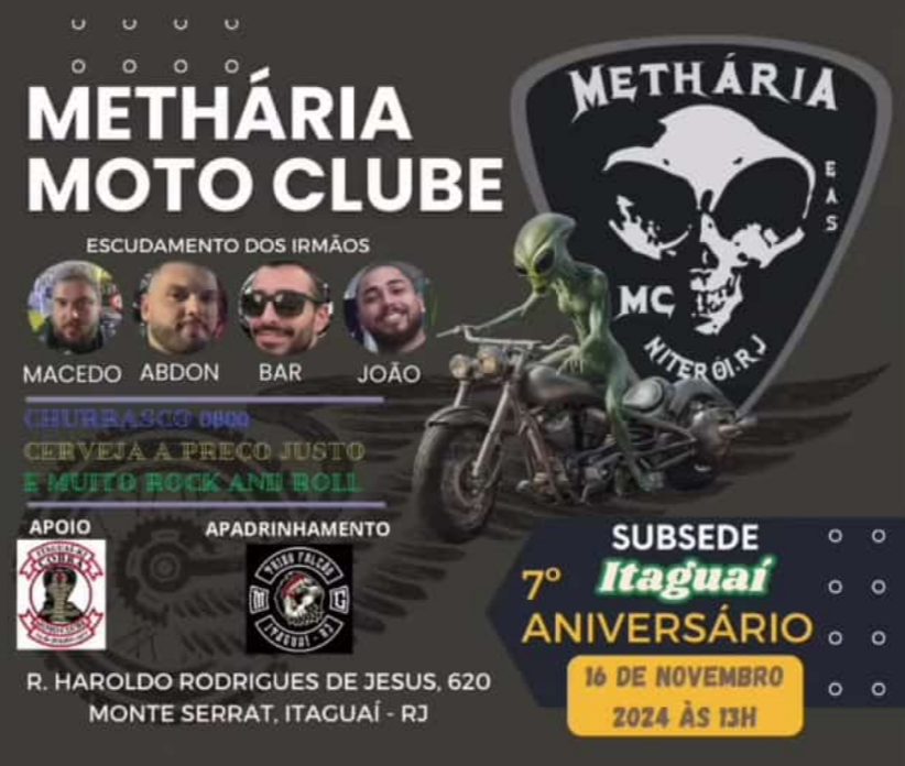 « Todos Eventos Este evento já passou. 7º Aniversário Methária MC novembro 16, 2024 - 13:00 « Pub dos Motociclistas 15/11 Sede Aberta Guerreiros Indomáveis » Adicionar ao calendário Google Agenda iCalendar Outlook 365 Outlook Live Detalhes Data: novembro 16, 2024 Hora: 13:00 - 23:30 Categoria de Evento: Aniversário de MC ou MG Local Subsede Methária MC – Itaguaí Rua Haroldo Rodrigues de Jesus, 620 Itaguaí, Rio de Janeiro Brazil + Google Map
