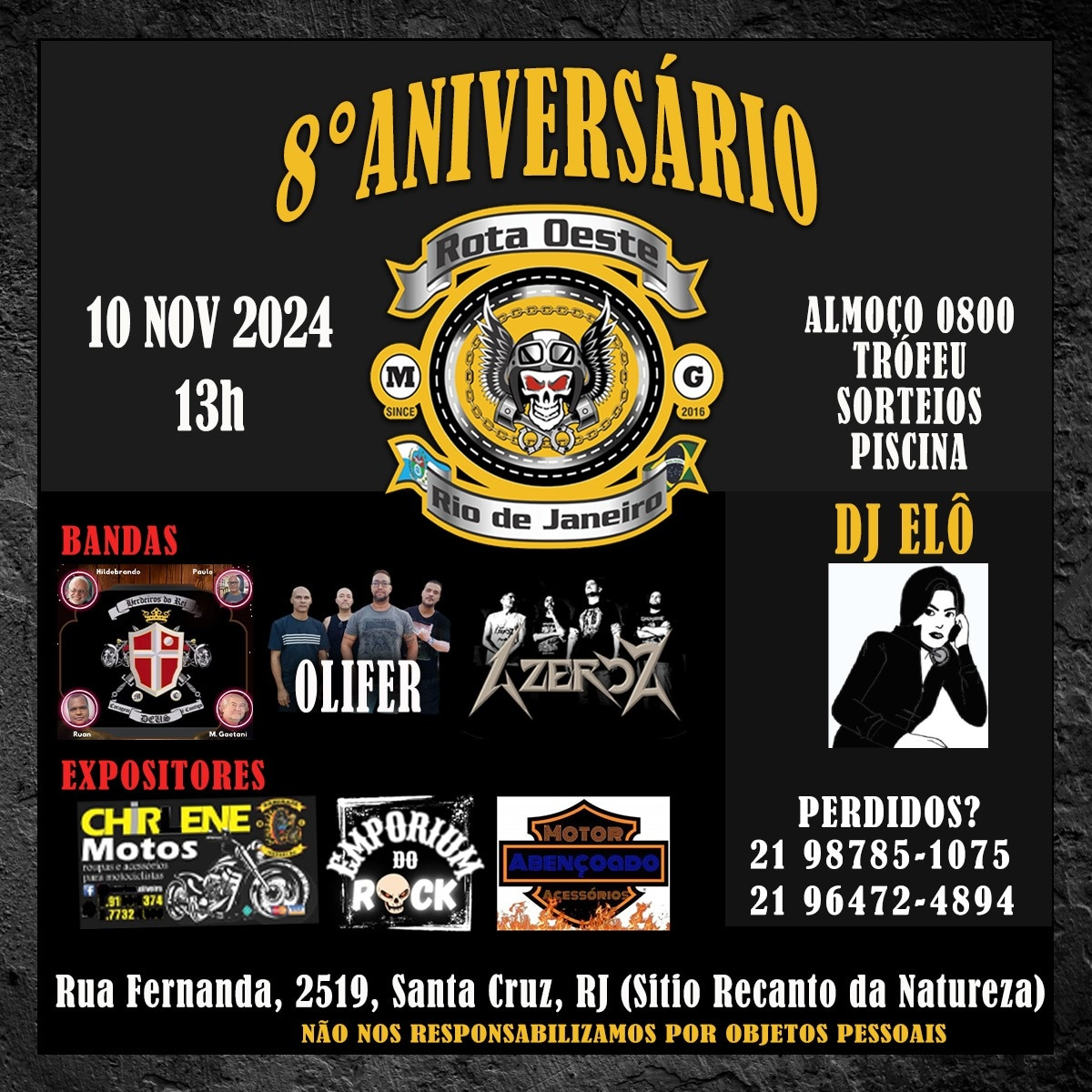 « Todos Eventos Este evento já passou. 8º Aniversário Rota Oeste novembro 10, 2024 - 13:00 « 47º Aniversário Cobra MC AMDZO-RJ » Adicionar ao calendário Google Agenda iCalendar Outlook 365 Outlook Live Detalhes Data: novembro 10, 2024 Hora: 13:00 - 23:30 Categoria de Evento: Aniversário de MC ou MG Organizador Rota Oeste MG Local Sítio Recanto da Natureza Rua Fernanda, 2516 - Santa Cruz Rio de Janeiro, Rio de Janeiro Brazil + Google Map Deixe um comentário Cancelar respostaVocê precisa fazer o login para publicar um comentário.