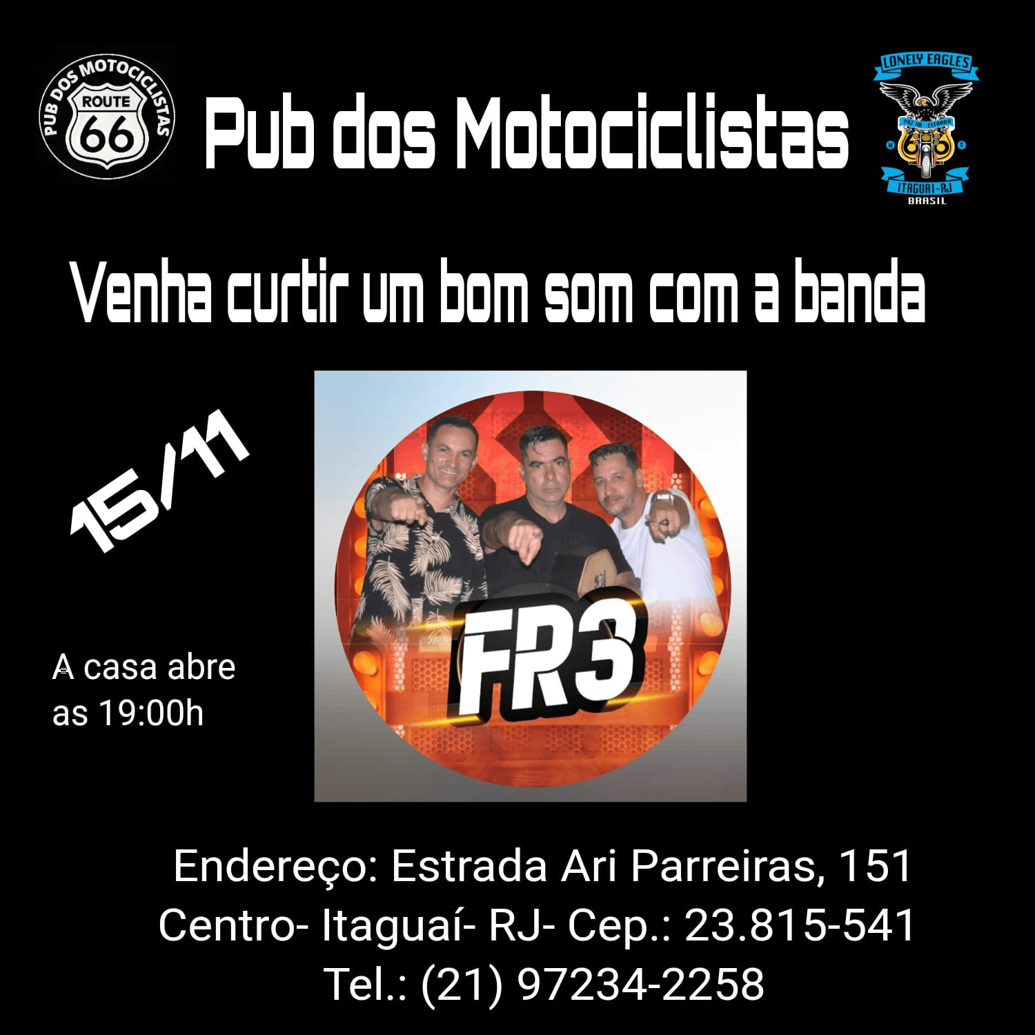 « Todos Eventos Este evento já passou. Pub dos Motociclistas 15/11 novembro 15, 2024 - 19:00 « 10º Aniv. Sociedade Alternativa e 7º Aniv. Estrada do Rock 7º Aniversário Methária MC » Adicionar ao calendário Google Agenda iCalendar Outlook 365 Outlook Live Detalhes Data: novembro 15, 2024 Hora: 19:00 - 23:30 Categoria de Evento: Sede Aberta Organizador Lonely Eagles MC Local Pub dos Motociclistas Itaguaí Rua Ary Parreiras, 151 Centro Itaguaí, Rio de Janeiro Brazil + Google Map Telefone (21) 97234-2258